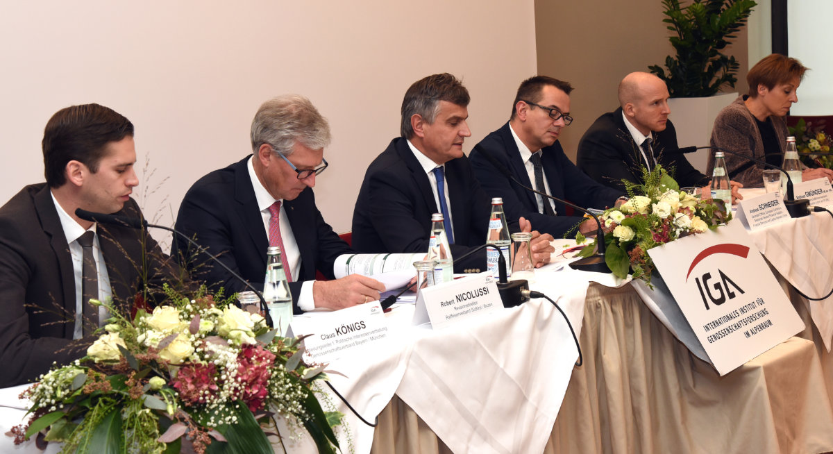 Vertreter aus Deutschland, der Schweiz, Italien und Österreich präsentierten zunächst den aktuellen Sparerschutz in den jeweiligen Ländern. Es referierten Claus Königs (Genossenschaftsverband Bayern), Andreas Gmünder (Universität Luzern), Robert Nicolussi (Raiffeisenverband Südtirol) und IGA-Vorstandsvorsitzender Arnulf Perkounigg (ehemaliger Direktor des Raiffeisenverbandes Tirol).